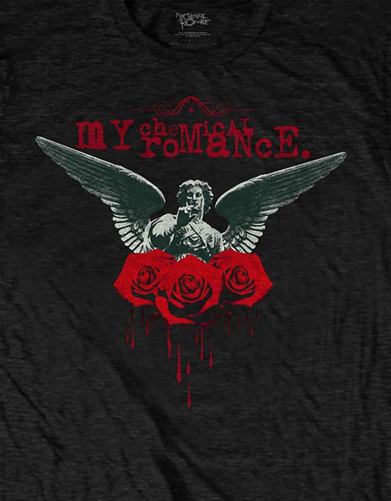 Minnie is a pretty simple one, but her outfit is actually made up of four different band tees. That’s a higher count than Yuqi, and better yet, this outfit is actually flattering. Starting with her jacket, we have a Slipknot logo. The angel and rose art beneath it, though, are not from a Slipknot shirt at all. The angel and roses are actually from a My Chemical Romance shirt, which I find pretty funny. Here’s the shirt in question.