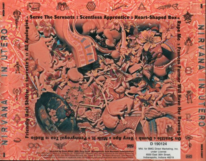 The title for In Utero actually comes from one of Courtney Love’s (his wife, lead singer of a band called Hole) poems. The cover art (the anatomical mannequin with angel wings on Soyeon’s shirt) was created by Nirvana’s art director Robert Fisher with Cobain’s instruction. The back collage, however, was created by frontman Kurt Cobain himself in his dining room. The symbols surrounding the tracklisting are pulled from Barbara G. Walker’s The Woman’s Dictionary of Symbols and Sacred Objects.