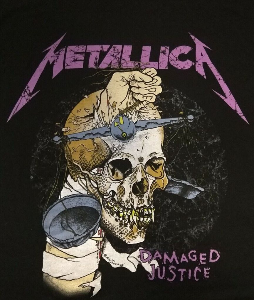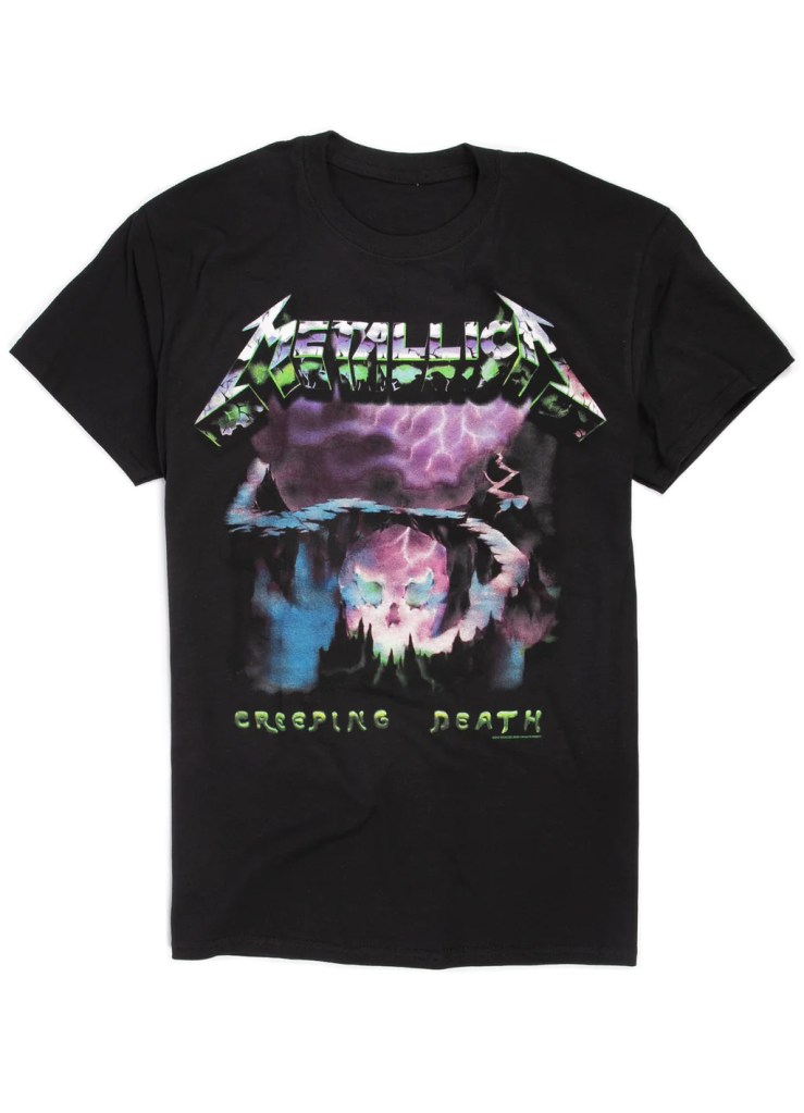 The shirt she’s wearing under her red corset is the Metallica “Creeping Death” shirt, which is a shame because you can only really see the text at the bottom and miss the entirety of the cool artwork. Metallica sells weathered versions of this on their website because they’re capitalist kings and know vintage shirt demand is high.