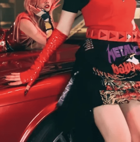 The Metallica portion of the skirt is the design of the Damaged Justice tee from their ’88 tour, just like the one Yuqi has as a sleeve. There’s a lot of reprints of this shirt so I doubt it’s a real vintage one, but hey, you never know! When looking up this shirt I also found pictures of Kesha wearing it, so that’s funny.