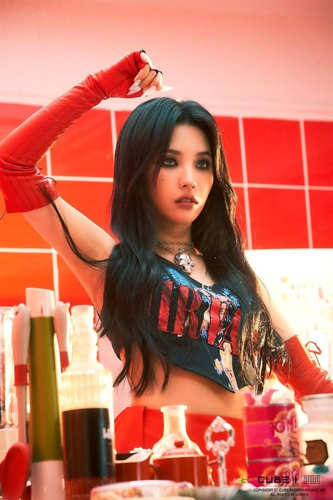 With the recent release of “Wife”, there’s no longer any doubt about the feminist themes Soyeon likes to include in (G)-IDLE’s work. If you were paying any attention, they’ve always been there. “TOMBOY” was the first explicit depiction of it, then “NXDE” disposed of any speculation; the feminism is here to stay. And while it’s obvious that these outfits were just created to use rocker imagery to make the girls look empowered and rebellious, the pick of an In Utero shirt for Soyeon has meaning regardless.