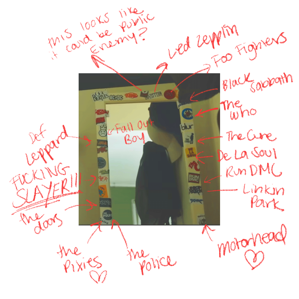 Now this mirror is truly giving “bought a band sticker pack off amazon” to me. You know, the listings with a pack of like 200 stickers of pngs scalped off the internet. Do I think that a set designer was intentional enough to select each individual music artist as a shout-out or statement from the team? No. I am thinking that this employee did the reasonable thing and just went with what they could find. Which is cool. It’s free advertising for these artists regardless.