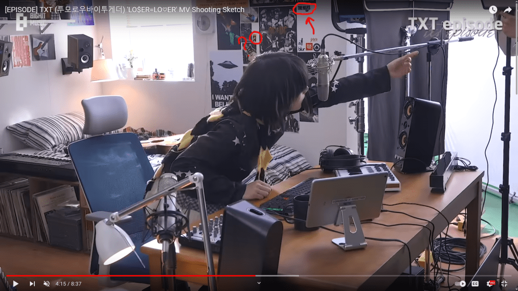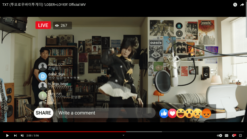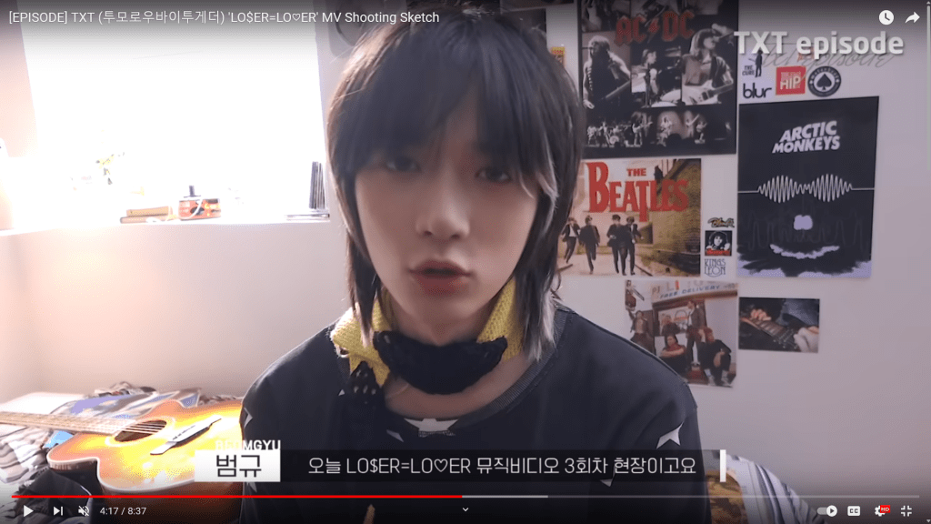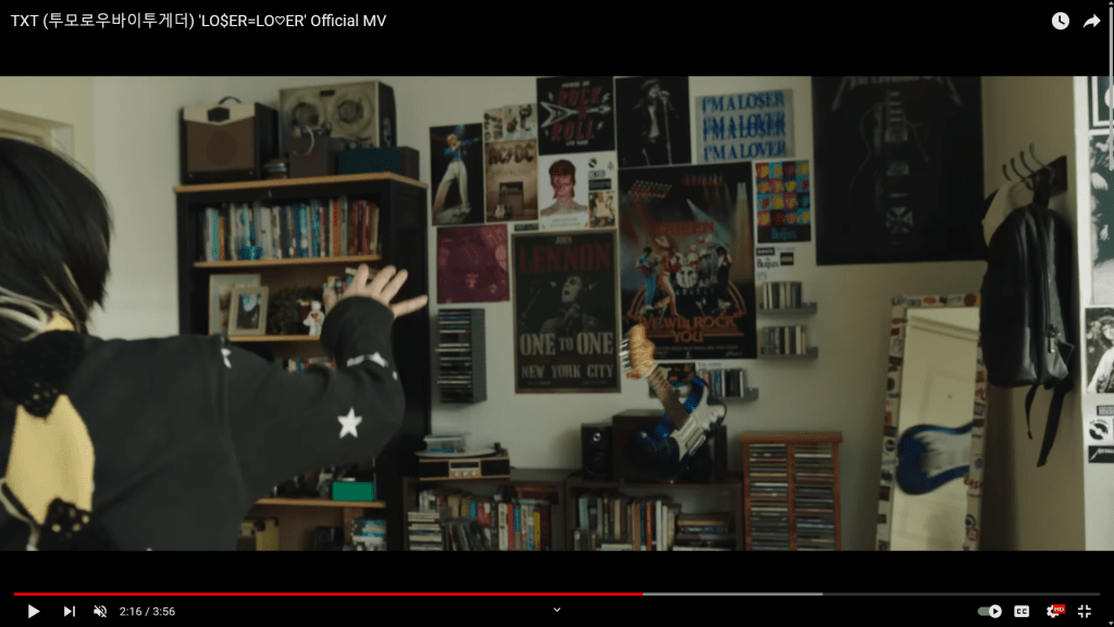 Now this music video is pretty interesting at least in terms of plot (which may not be the purpose of this post but humor me). All the boys are doing their little shenanigans with their self-insert “y/n” faceless actresses. Except for Beomgyu, that is. Beomgyu isn’t allowed to have love. Instead he is berated by an abusive father on livestream. Theorists probably have a long winded explanation for this, but to tell you the truth, I don’t really care about kpop fictional universe lore. My point is that Beomgyu isn’t out and about like the other boys, he’s in his teenage rocker bedroom (until he wipes out on a bike and cries about it later but that’s not relevant right now).